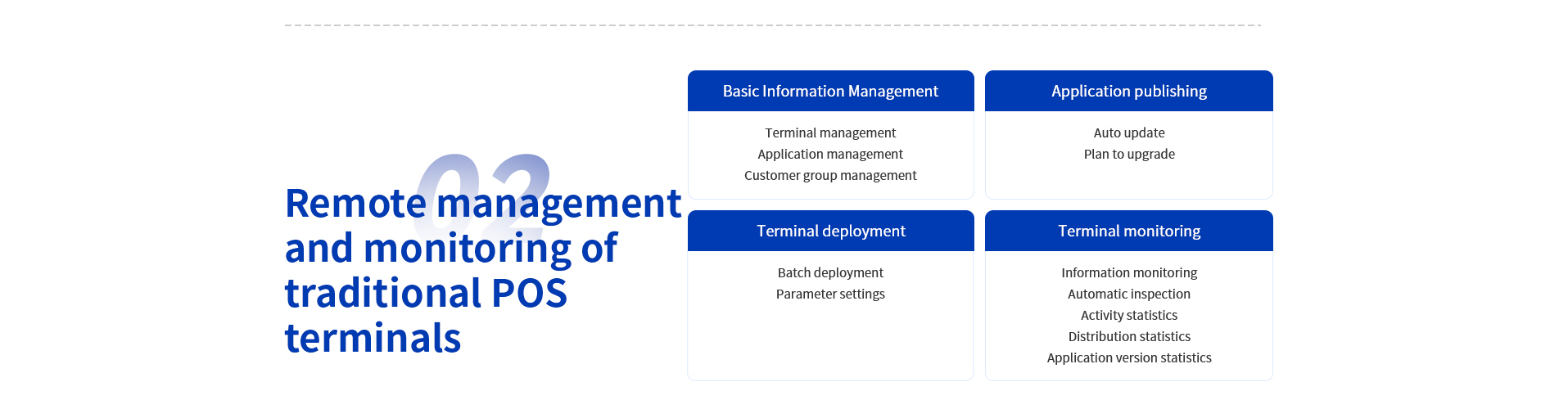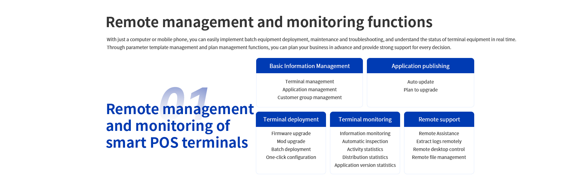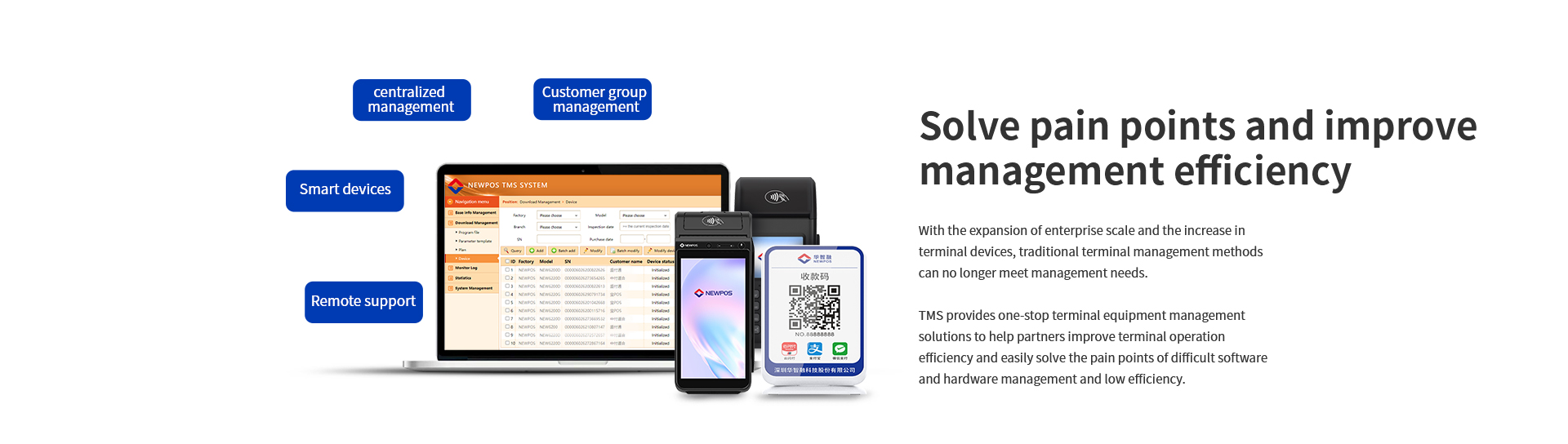 Improve terminal management efficiency and create intelligent operations.The TMS management system provides partners with remote management, terminal deployment, equipment status monitoring, remote support and other services for all types of terminal products.