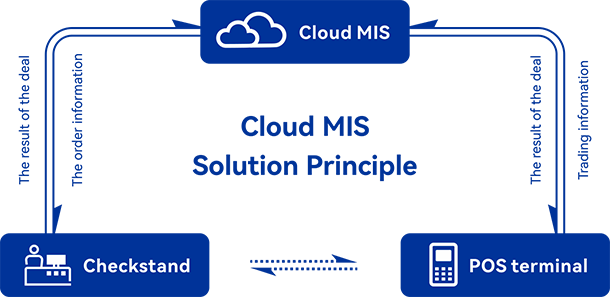 NEWPOS Cloud MIS is based on the transaction orders created by the cash register (upper computer), which are pushed to the NEWPOS Cloud MIS system platform through a wireless network, and then distributed by the platform to POS terminals to realize wireless electronic payment.